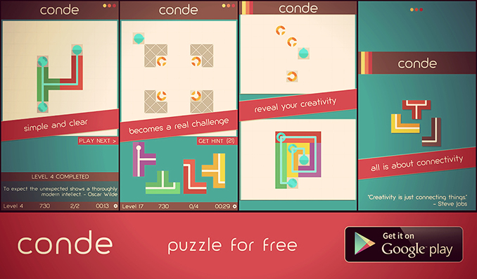Conde is about connecting some sources to receivers using tetris-like blocks with inner "channels". I know games like "pipe game" but that's totally different problem to solve in Conde. Conde is very elegant puzzle, because you can "build" the solution step by step and it scales very well, the gameplay and rules are incredibly simple.